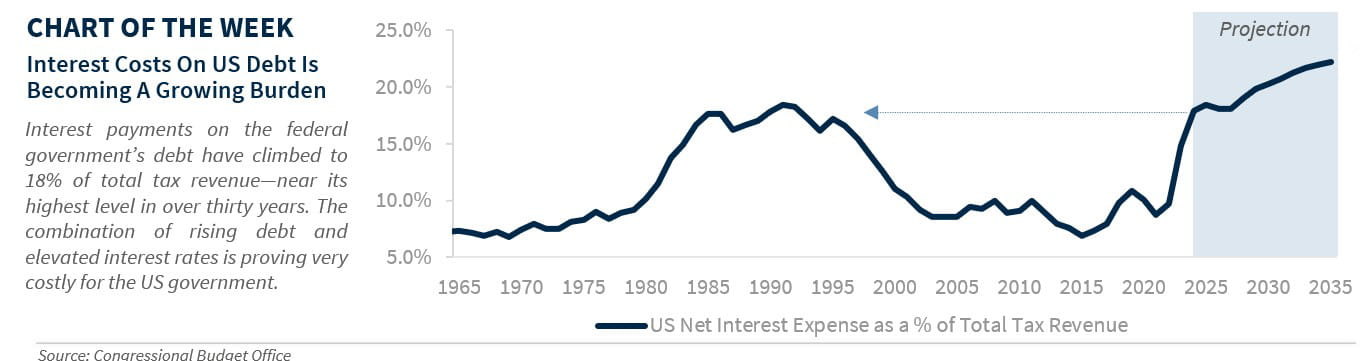 - Rising National Debt—The US national debt is climbing at an unsustainable pace—now over $37t and projected to hit $50t within the next decade. The combination of soaring debt and elevated interest rates is proving costly, with interest payments now the 2nd largest item in the federal budget, consuming 18% of total revenues in FY24—up from 11% in FY19. As pandemic-era debt issued at ultra-low rates gets refinanced at today’s higher levels, the average cost to service the debt has jumped to ~3.4%, up from just 1.5% in 2022. These mounting costs are a key reason why President Trump and the Treasury Dept. have been laser-focused on pushing interest rates lower.
